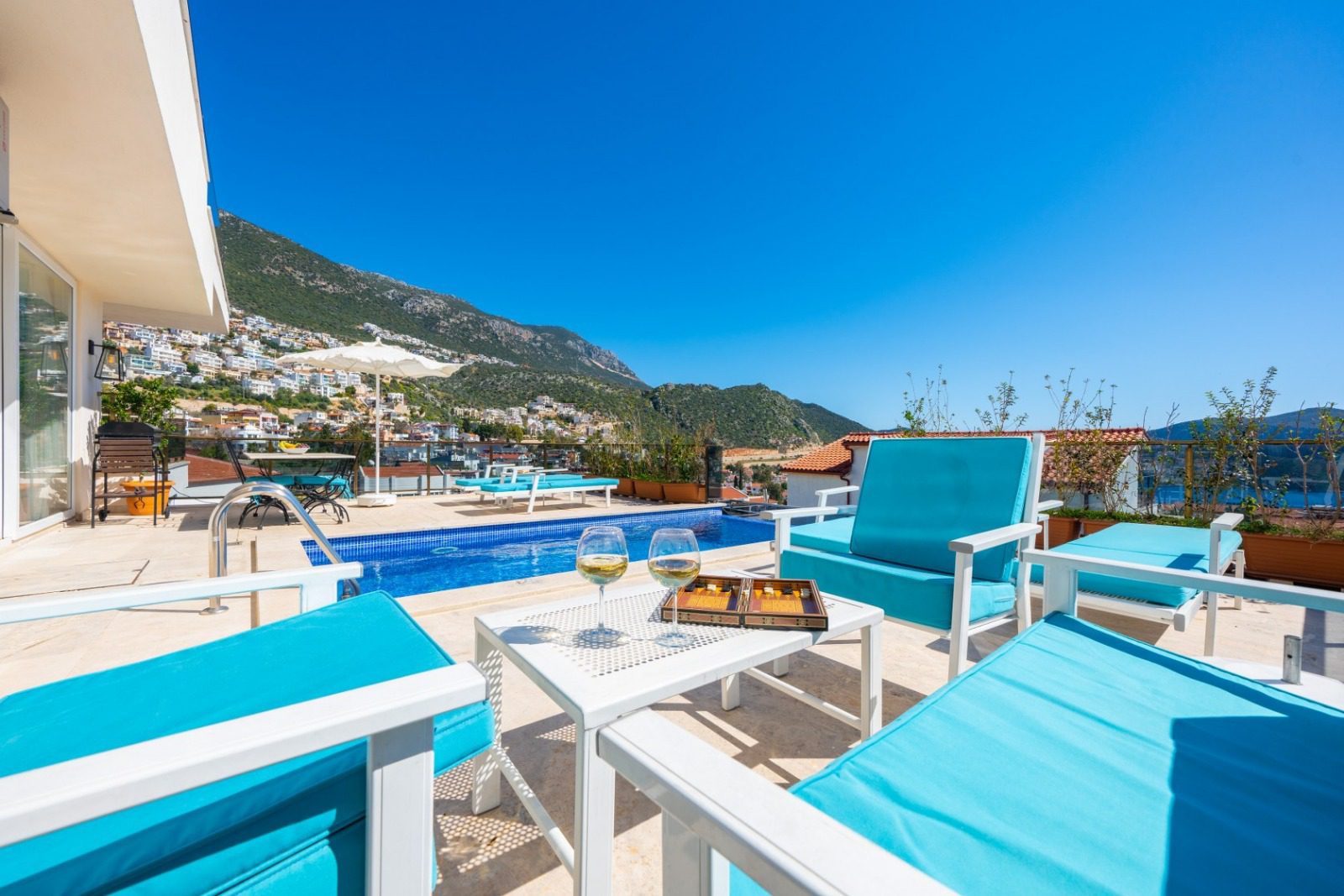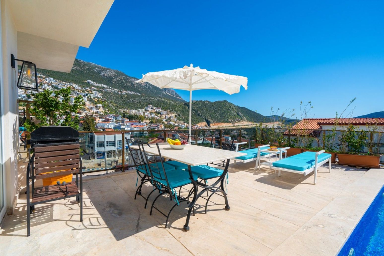 The highlight of the apartment is its private terrace, complete with plunge pool, sun loungers, an alfresco dining area, and relaxed seating—all positioned to enjoy the view over Kalkan Bay. Conveniently located within easy walking distance of shops, cafes, and Kalkan Old Town, it’s ideal for both holiday use and rental.