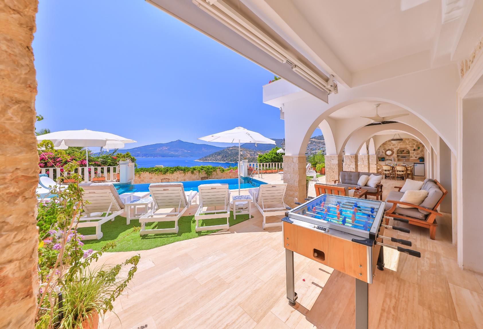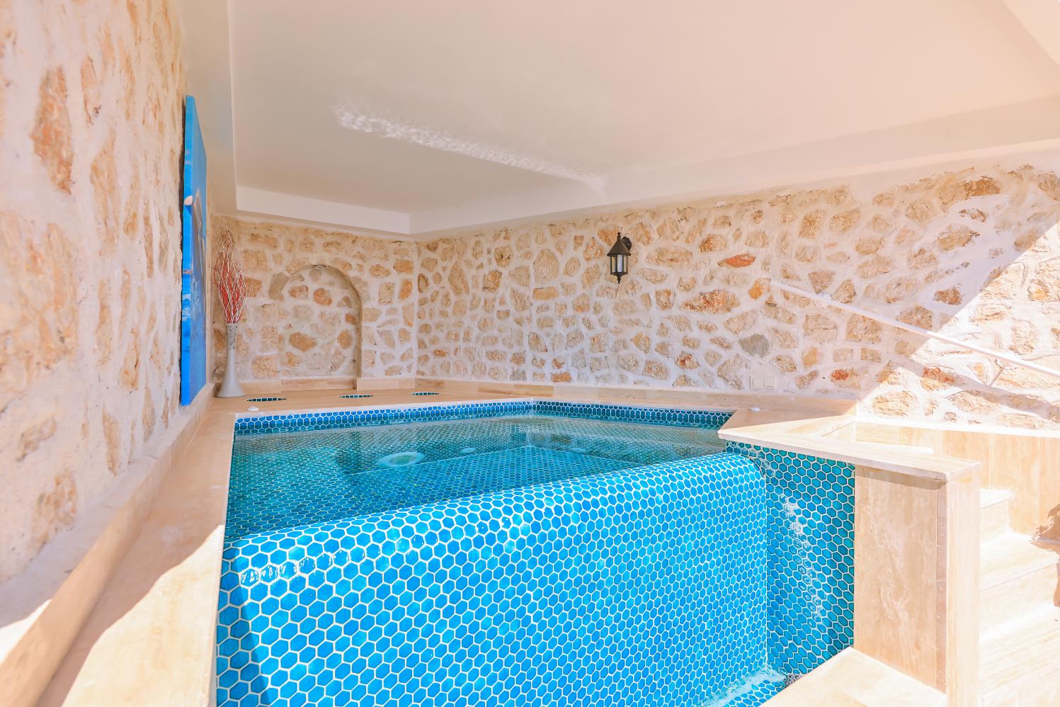 Outdoor amenities include a stunning main pool (7m x 4m, 1.65m deep) with a distinctive saltwater feature, plus two additional heated jacuzzis and a shallow pool area, all thoughtfully arranged for leisure and relaxation. Wellness and entertainment are further enhanced by a private sauna, Turkish bath, fully equipped fitness room, game room, and table tennis area.